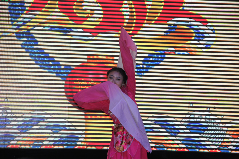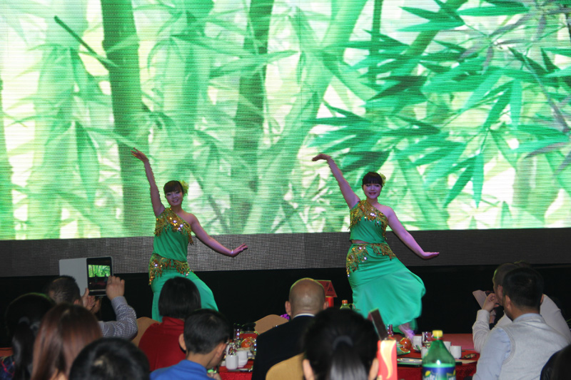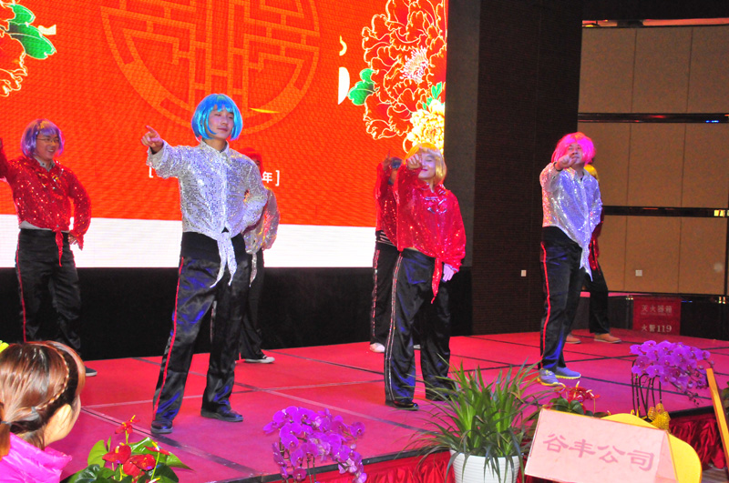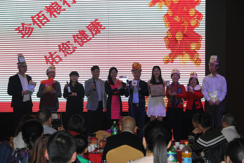 团拜会上,集团及各经营单元的员工纷纷展示自己的才艺。济农公司的员工首先表演多人舞蹈《小苹果》,奇特的服装、奔放的舞姿一下子就点燃了整个会场的气氛。联合信息员工表演的小品《艺术鼎天》让人捧腹大笑;济农公司员工自编自演的小品《葱葱那年》贴近工作,幽默生动,观众笑声不断;集团各职能部门选送的节目《珍佰粮产品秀》赚足了大家的眼球,大家看到了各部门领导和员工工作之外的另一面;珍佰粮行员工表演的舞蹈《惊鸿舞》不时引得台下的阵阵掌声;谷丰公司员工表演的舞蹈《雨竹林》将观众带入了优美的意境之中。济农销售部李西峰的吉他弹唱《故乡》和《春天里》让观众们欢呼不已。济农公司领导和CGA经销商的对唱、经销商父子的同台献艺都一次次把大会气氛推向了高潮。整个团拜会节目精彩纷呈,宴会大厅成了欢乐的海洋。节目中间穿插的抽奖活动和游戏“产品蹲”等吸引了众多员工的积极参与。