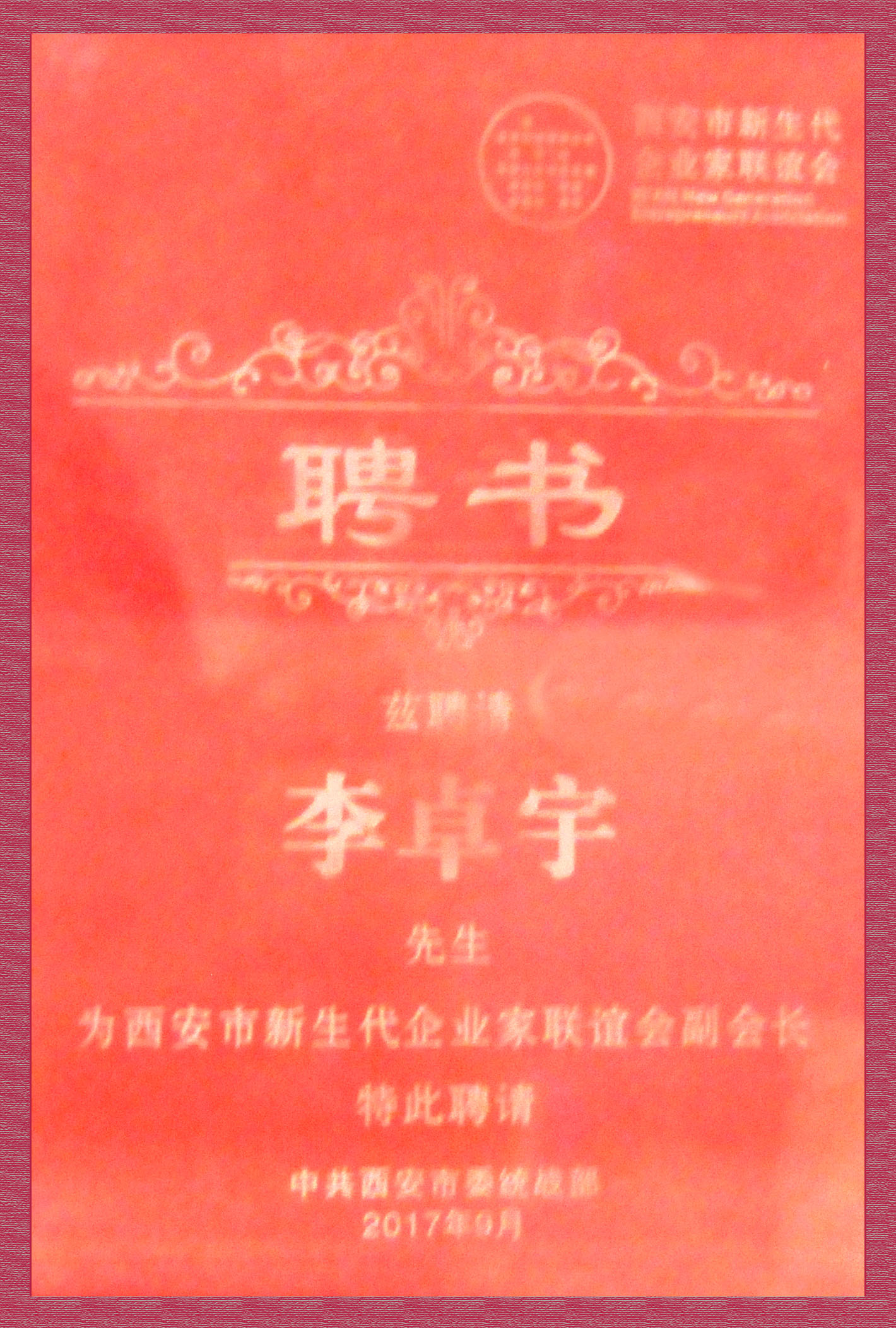 会上选举产生了西安市新生代企业家联谊会领导班子,李卓宇先生被聘为副会长,并颁发受任聘书。史晓红要求领导班子要组织会员加强学习,用先进理论武装头脑,努力提高自身素质,做到听党话、跟党走,在思想上、政治上、行动上始终同以习近平同志为核心的党中央保持高度一致。脚踏实地,不忘初心,继承和发扬老一代企业家的光荣传统,积极参与光彩事业、慈善事业和精准扶贫行动,为我市全面建成小康社会多做贡献。